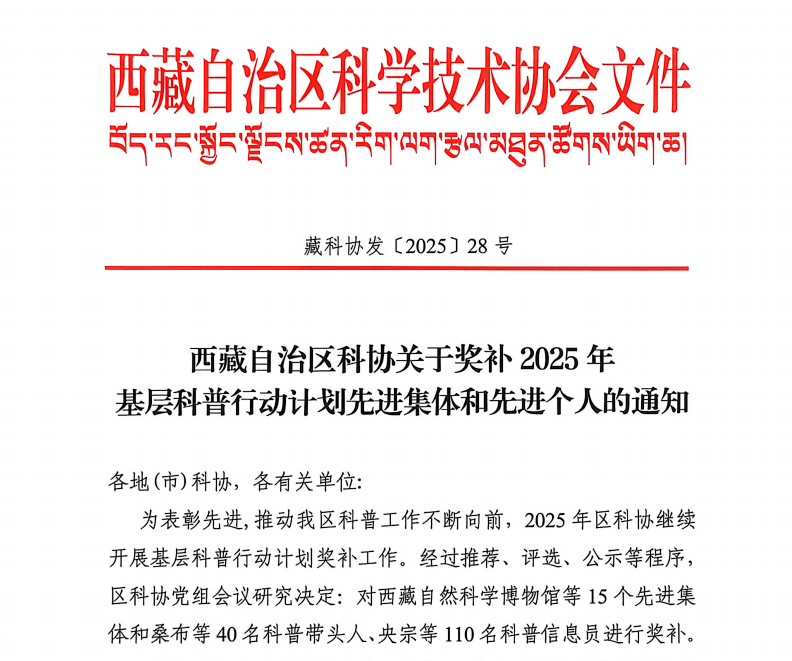 祝贺!昌都市农业技术推广总站获“基层科普行动计划先进集体”荣誉称号!