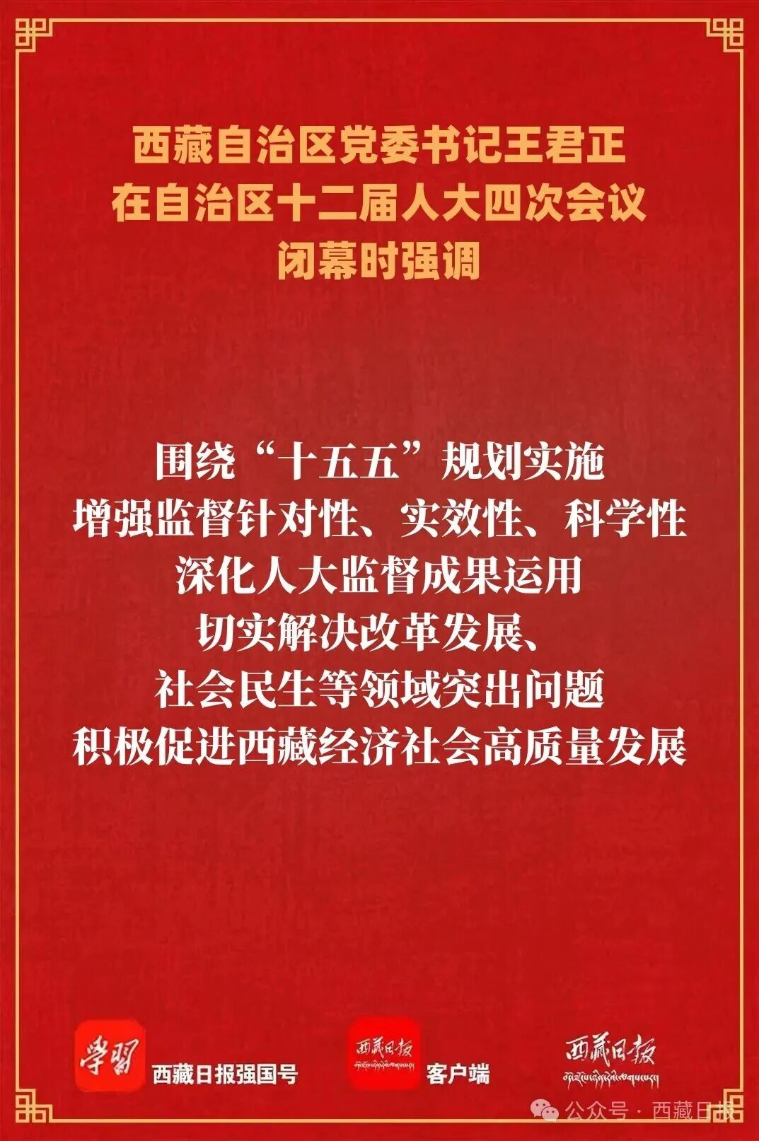 王君正指出,自治区十二届人大四次会议是一次实干兴藏、奋战开局、共谋新篇的大会。会议审议通过的“十五五”时期西藏自治区国民经济和社会发展规划纲要,深入贯彻了党的二十届四中全会精神,全面贯彻了习近平总书记关于西藏工作的重要指示和新时代党的治藏方略,把习近平总书记为西藏擘画的宏伟蓝图细化为“十五五”时期的具体目标任务,实化为确保“十五五”开好局起好步的各项工作举措,充分彰显了中国特色社会主义制度优势,集中体现了全区各族人民对美好生活的期盼向往,吹响了启航“十五五”、迈向新征程的奋斗号角。全区各级各部门和广大干部要深刻领悟“两个确立”的决定性意义,增强“四个意识”、坚定“四个自信”、做到“两个维护”,按照本次会议确定的目标任务,以高度的政治责任感和强烈的历史使命感,扎实围绕“四件大事”落实,推动长治久安和高质量发展,真正把宏伟蓝图变为美好现实。